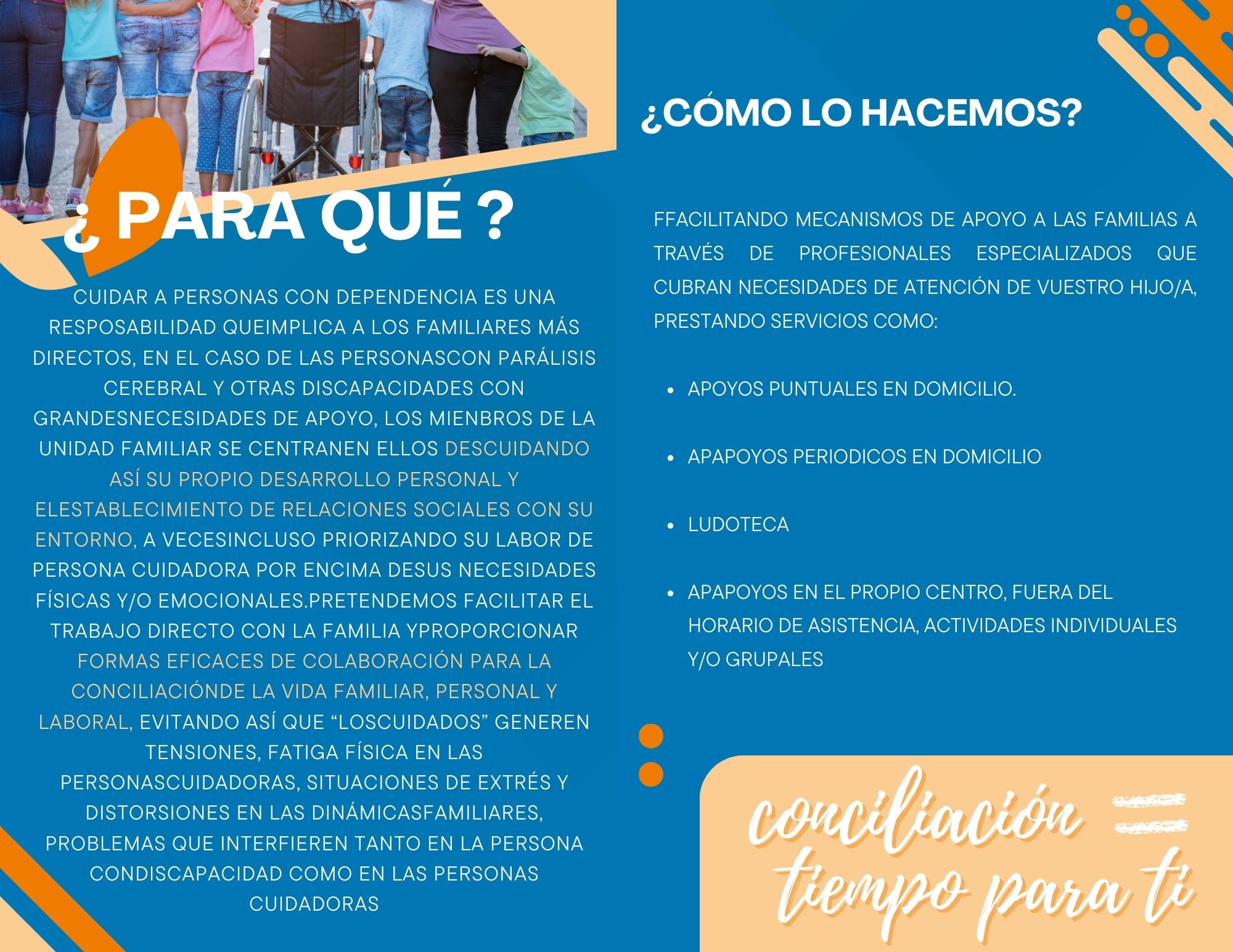 CUIDAR A PERSONAS CON DEPENDENCIA ES UNA RESPOSABILIDAD QUEIMPLICA A LOS FAMILIARES MÁS DIRECTOS, EN EL CASO DE LAS PERSONASCON PARÁLISIS CEREBRAL Y OTRAS DISCAPACIDADES CON GRANDESNECESIDADES DE APOYO, LOS MIENBROS DE LA UNIDAD FAMILIAR SE CENTRANEN ELLOS DESCUIDANDO ASÍ SU PROPIO DESARROLLO PERSONAL Y ELESTABLECIMIENTO DE RELACIONES SOCIALES CON SU ENTORNO, A VECESINCLUSO PRIORIZANDO SU LABOR DE PERSONA CUIDADORA POR ENCIMA DESUS NECESIDADES FÍSICAS Y/O EMOCIONALES.PRETENDEMOS FACILITAR EL TRABAJO DIRECTO CON LA FAMILIA YPROPORCIONAR FORMAS EFICACES DE COLABORACIÓN PARA LA CONCILIACIÓNDE LA VIDA FAMILIAR, PERSONAL Y LABORAL, EVITANDO ASÍ QUE “LOSCUIDADOS” GENEREN TENSIONES, FATIGA FÍSICA EN LAS PERSONASCUIDADORAS, SITUACIONES DE EXTRÉS Y DISTORSIONES EN LAS DINÁMICASFAMILIARES, PROBLEMAS QUE INTERFIEREN TANTO EN LA PERSONA CONDISCAPACIDAD COMO EN LAS PERSONAS CUIDADORAS